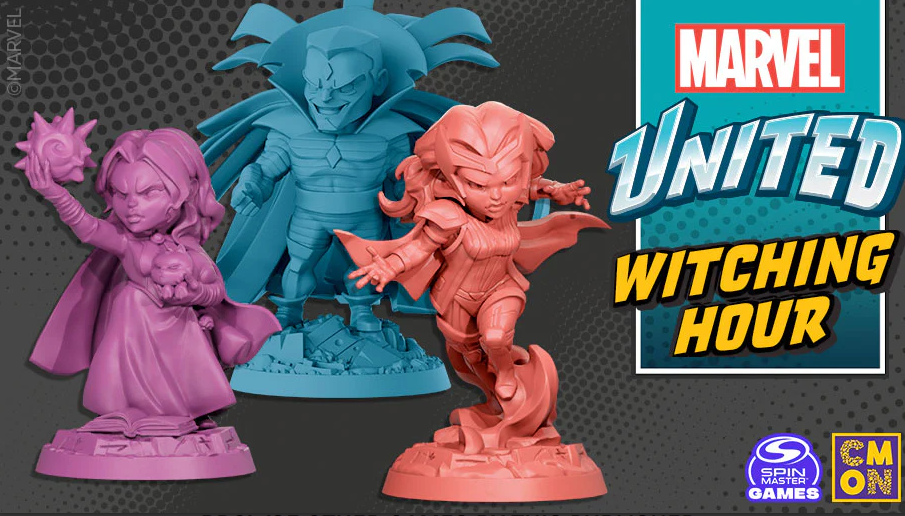 Witching Hour is a special character pack that not only adds two new characters to Marvel United: Agatha Harkness as an Anti-Hero and Scarlet Witch, for the first time as a solo Villain, but also includes the four alternate Hero decks that were previously available mainly at conventions: Grey Hulk, Juggernaut, Mister Sinister, and Deadpool (X-Force). To fully flesh out these alternate versions, this box also includes copies of their original game pieces, cast in their new appropriate colors. The back of their cards are marked as “2nd Printing” to distinguish them from the original convention runs.